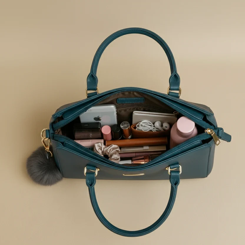 - Spacious main compartment for essentials like laptop, wallet, and makeup