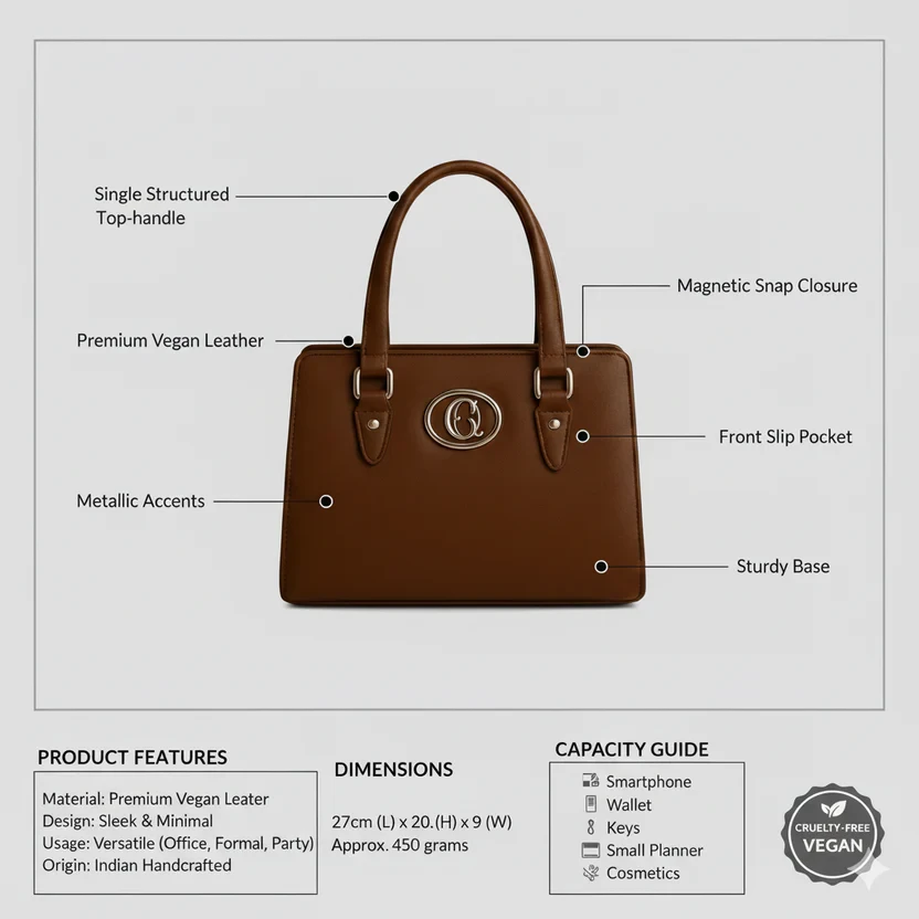 The Vegan Leather Handbag with Silver GG Logo is a premium black handbag with golden highlights, luxurious detailing, and a versatile structured body — a true blend of fashion and function.